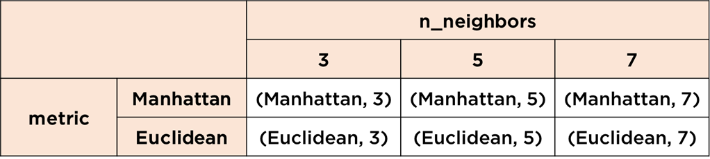 예를 들어, 아래 그림에서는 k-최근접 이웃의 하이퍼파라미터인 이웃수(n_neighbors)와 거리 척도 (metric)에 대한 하이퍼 파라미터 그리드를 보여준다. 이 그리드에서 이웃 수는 {3, 5, 7}의 범위에서, 거리 척도는 {Manhattan, Euclidean}의 범위에서 튜닝되며, 그 결과로 총 3 x 2 = 6개의 파라미터 조합이 생성되었다. 이제 이 모든 조합을 비교하여 최적의 파라미터를 찾으면 된다. 물론 전역 최적이 아니라, 지역 최적일 가능성이 매우매우 높겠지만 말이다.