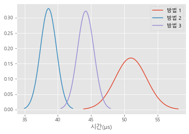 각 방법을 실행했을 때 소요된 시간의 평균과 표준편차를 사용하여 정규 분포로 도식화하면 다음과 같습니다.