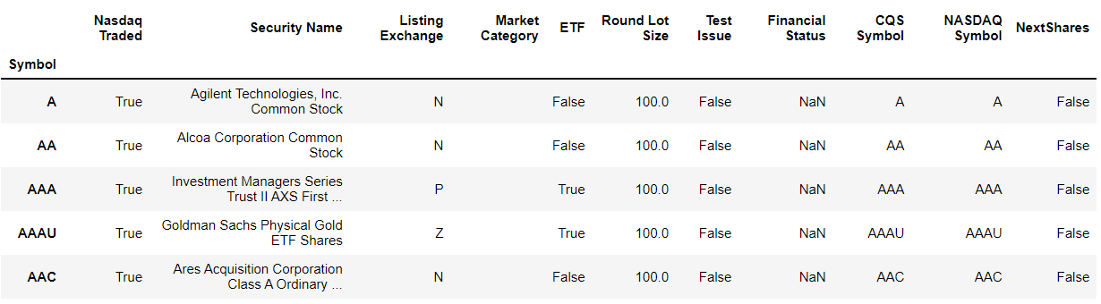 실행 결과에서 각 컬럼의 정보는 다음과 같습니다 (출처: https://www.nasdaqtrader.com/trader.aspx?id=symboldirdefs)