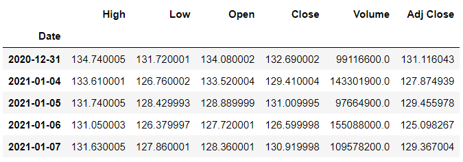 df = reader.DataReader('AAPL', 'yahoo', start=start_date, end=end_date)