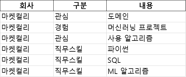 가령 마켓컬리의 자격요건은 다음과 같이 변환했습니다.