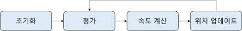 입자 군집 최적화는 아래 그림에 도식화된 바와 같이 초기화, 평가, 속도 계산, 위치 업데이트의 네 단계로 구성되며, 평가 단계에서 종료 조건이 만족하면 알고리즘을 종료합니다.