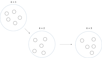 위 그림에서 k 는 이터레이션을 나타내며, 작은 원과 큰 원은 각각 입자와 군집을 나타냅니다. 즉, 여러 개의 입자가 하나의 군집을 이뤄 실행 가능 공간을 탐색합니다.