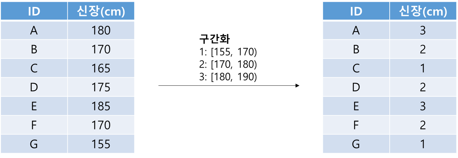 위 예시에서는 신장(cm)이란 변수를 세 개의 구간으로 구간화했습니다. 즉, 신장이 180cm이던 A란 사람은 [180, 190)의 구간에 속하므로 신장이 3으로 변했고, 신장이 175인 D란 사람은 [170, 180)이란 구간에 속하므로 2로 변했습니다.