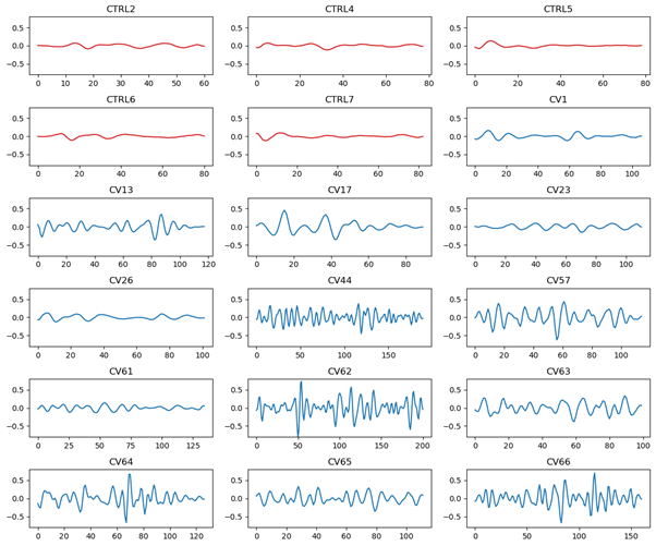 특히 Jerk RMS 관련 변수가 실험군과 대조군 간 차이를 가장 잘 설명하는 것으로 나타났다. 예를 들어, 아래 그림은 대조군(빨간색)과 실험군(파란색)의 왼쪽 발목에 대해 jerk를 시각화한 결과이다.