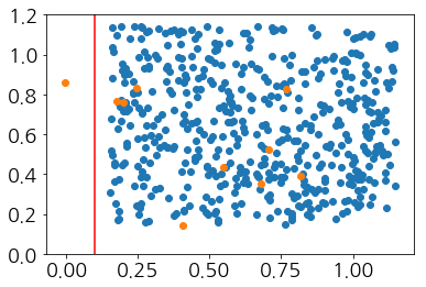 (2) 높은 정확도를 보인다. 정확도는 매우 직관적이라는 장점때문에, 널리 사용되는 분류 결과 평가 척도이다. 그런데 클래스 불균형 문제로 인해 편향된 모델은 매우 높은 정확도를 보인다. 높은 정확도를 보이는 것이 문제인 이유는, 전혀 쓸모없는 수준의 모델일지라도 정확도가 높아 좋은 모델이라고 착각하게 만들 수 있기 때문이다. 저자가 임의로 그은 직선을 다시 살펴보자. 이 직선은 총 1010개(파란색:1000개, 주황색:10개)의 샘플 가운데, 1001개를 정분류했다. 즉, 1001/1010 = 99.1%라는 매우 높은 정확도를 보인다. 심지어 이 정확도는 새로 들어온 데이터(테스트 데이터)에 대해서도 유지될 가능성이 높다. 그런데 주황색 샘플만 놓고 보면, 10개 가운데 1개만 정분류되어 잘 분류되었다고 보기 힘들다.