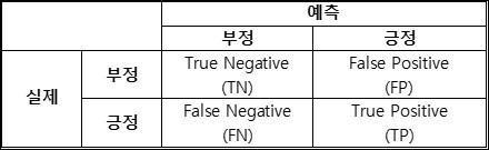 혼동 행렬이란 분류 결과를 평가하는데 사용하는 표로, 그 구조는 아래와 같다.
