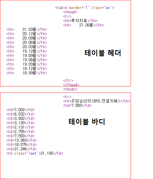 tr이라는 요소에 제목 셀이 th (예: 주당순이익 (EPS,연결지배))로 되어 있고, 값이 td로 되어 있는 것을 알 수 있다.