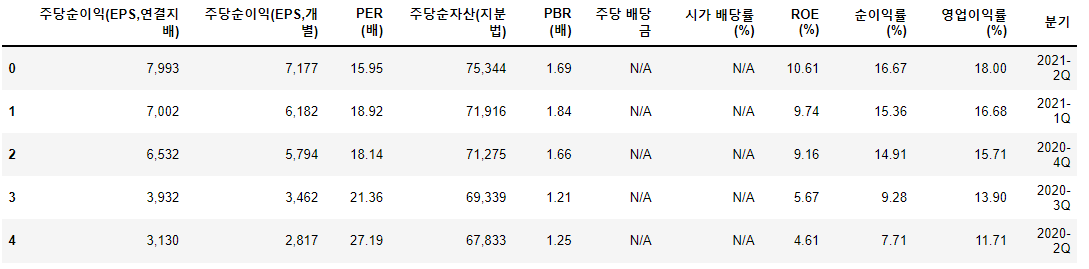 보다시피, SK하이닉스의 다양한 투자지표가 테이블 형태로 정리된 것을 볼 수 있다.