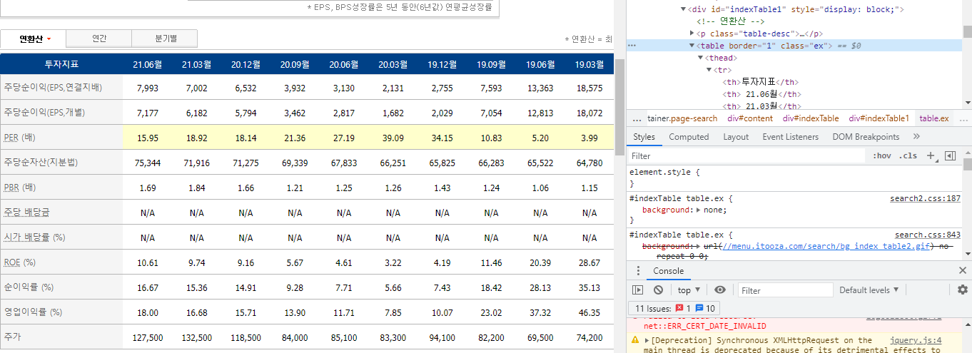 본 포스팅에서는 투자시에 자주 참고하게 되는 EPS, PER, 영업이익률 등의 투자지표를 크롤링하는 방법을 소개한다.