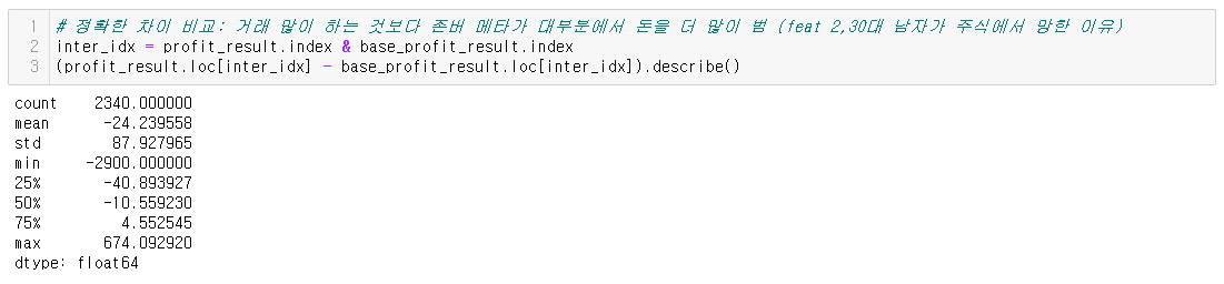 각 종목에 대해, 여기서 제시한 전략의 수익(%)에서 존버전략의 수익(%)을 뺀 결과의 통계량은 다음과 같다.