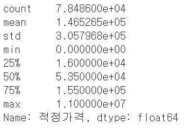 먼저, 적정 가격에 콤마(,)가 포함되어 있어 문자열로 인식되는 문제가 있으니, 다음과 같이 숫자로 변환해준 뒤 적정 가격의 분포를 확인한다.