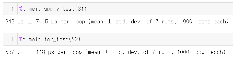 apply_test 함수는 S가 입력되면 S의 요소에 제곱을 취하는 람다 함수를 apply한 것이고, for_test 함수는 S가 입력되면 S의 요소를 순회하면서 제곱을 취하는 것이다.