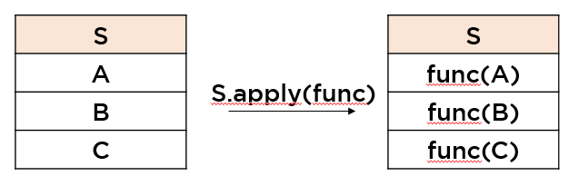 시리즈를 예로 들어 설명하면 아래 그림과 같이, S라는 시리즈에 있는 요소 A, B, C에 일괄적으로 함수 func을 적용하는데 사용하는 메서드가 apply인 것이다.