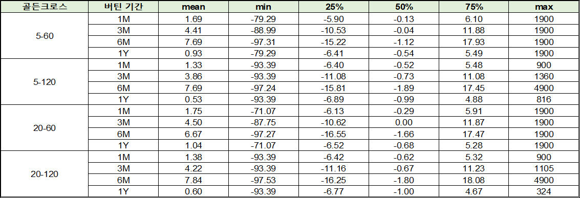 - 골든크로스 지점에서 매수하고 1, 3, 6, 12개월 후 매도했을 때의 기대 수익 계산