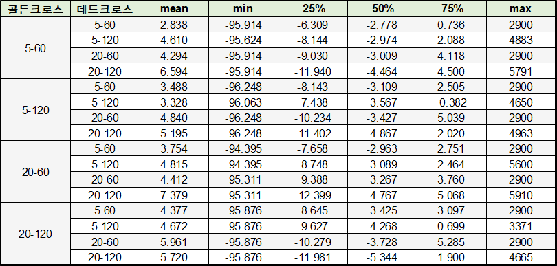 - 골든크로스 지점에서 매수하고 바로 이어지는 데드크로스 지점에서 매도했을 때의 기대 수익 계산