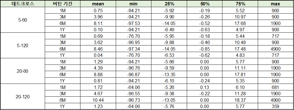 - 데드크로스 지점에서 매수하고 1, 3, 6, 12개월 후 매도했을 때의 기대 수익 계산