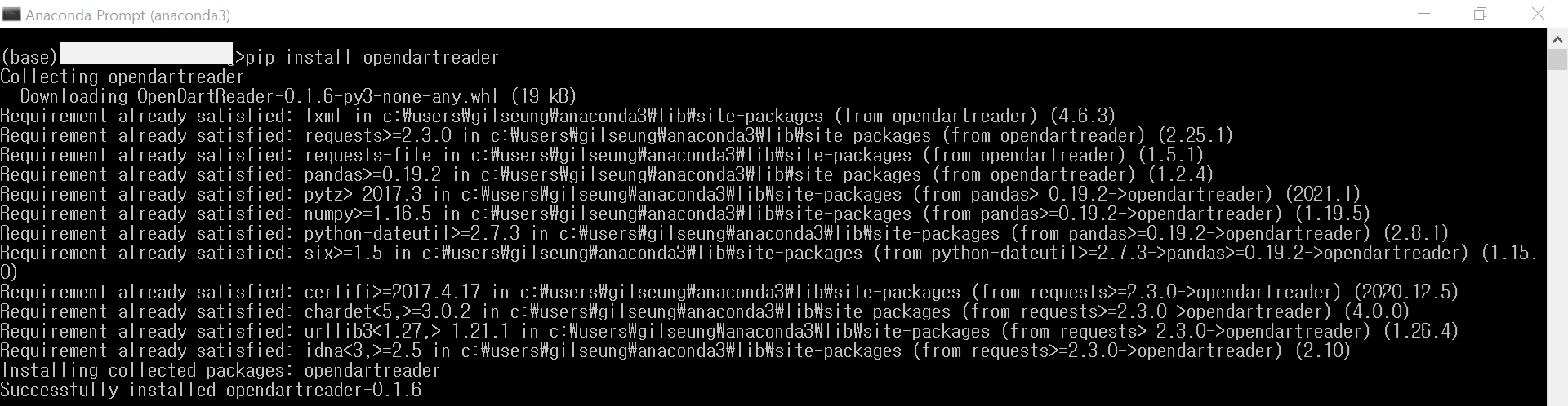 OPEN DART를 조금 더 쉽게 사용할 수 있는 파이썬 패키지인 OpenDartReader를 설치해줍니다.