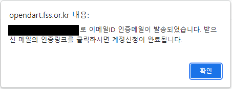 그리고나서 4번 버튼을 클릭해주면, 인증 메일이 발송되었다는 팝업이 다음과 같이 뜹니다.