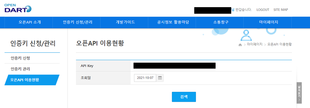 이제 다시 Open DART 홈페이지에 접속해서 인증키를 신청할 때 사용했던 이메일과 비밀번호로 로그인한 뒤, 인증키 신청/관리 – 오픈 API 이용현황을 클릭하면 아래 그림과 같이 API Key가 발급되었음을 확인할 수 있습니다.
