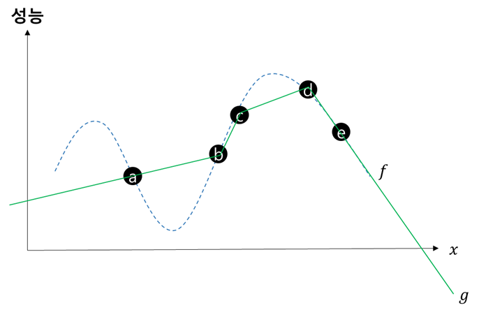 결론적으로는 데이터를 바탕으로 함수를 피팅하고 이 함수를 최대화하는 문제의 최적해를 구하면 되는구나라고 생각할 수도 있습니다. 여기서 가장 중요한 점은 이 함수가 그럴싸해야 한다는 것입니다. 저 다섯개 포인트를 통과하는 함수는 무한히 많습니다. 포인트가 엄청나게 많더라도 모든 포인트를 지나는 함수 역시 무한히 많습니다. 즉, 실제로는 c와 d사이에서 최댓값이 있지만, 근사하는 과정에서 d가 최댓값인 것처럼 되었습니다.
