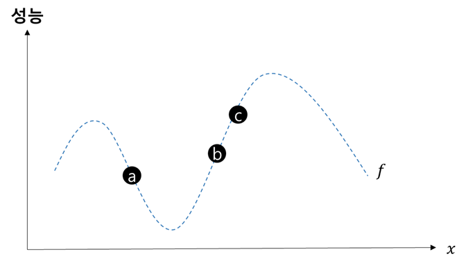 일반적인 최적화 문제보다 어려운 점은 목적이 되는 함수를 정확히 알 수 없기에, 최적화 방법론을 적용할 수 없다는 것입니다. 따라서 아래 그림과 같이 데이터를 바탕으로 함수를 추정하고 이 함수의 최대 혹은 최소값을 찾아야 합니다.