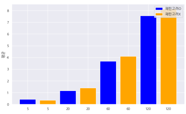 20 plt.bar([1, 3, 5, 7], no_pat_mean_list, color = "orange", label = "패턴고려X")