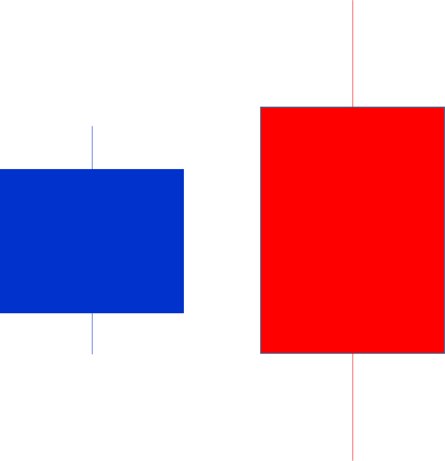 하락장악형은 대표적인 매도 신호 패턴으로 다음 그림과 같이 양봉을 완전히 감싸는 음봉이 출현한 패턴을 뜻합니다.