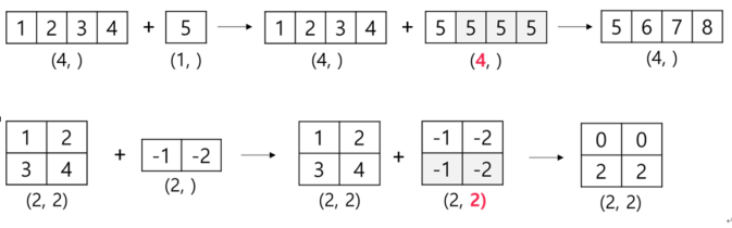 위 그림은 [1, 2, 3, 4]와 [5]가 더해지는 과정입니다. 두 배열의 크기가 다른데, [5]가 네 번 복제되면 더할 수 있습니다. 즉, 브로드캐스팅에 의해서 5가 [5, 5, 5, 5]로 변환되어 [1, 2, 3, 4]와 더해져 [6, 7, 8, 9]가 되었습니다. 아래 그림은 [[1, 2], [3, 4]]와 [-1, -2]가 더해지는 과정입니다. 여기서는 [-1, -2]가 두 번 복제되어 연산이 이뤄졌습니다.