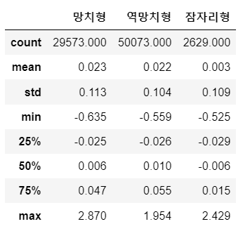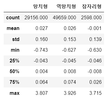 result.columns = ["망치형", "역망치형", "잠자리형"]