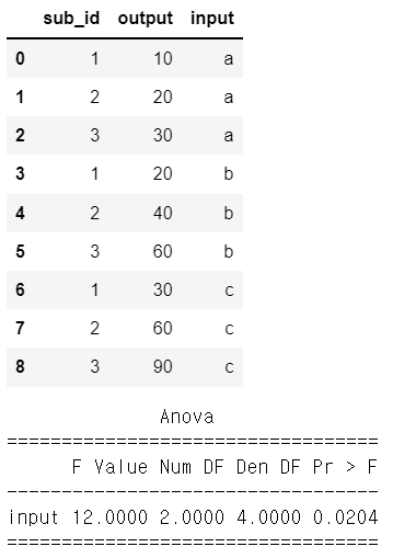 결과를 보면 p-value가 1인 것을 알 수 있는데, 그 이유는 조건에 관계없이 반응 변수가 변하지 않았기 때문입니다. 다시 말해, sub_id가 1인 샘플을 보면, input이 a, b, c일때 모두 10이고, sub_id가 2인 샘플은 모두 20, 3인 샘플은 모두 30입니다.