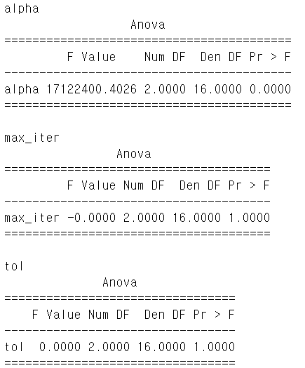 result_ANOVA = result.sort_values(by = ["alpha", "max_iter", "tol"])