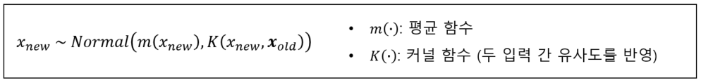 함수 값은 다변량 정규 분포를 따른다고 가정하며, 함수값 간 관계는 커널로 정의합니다.