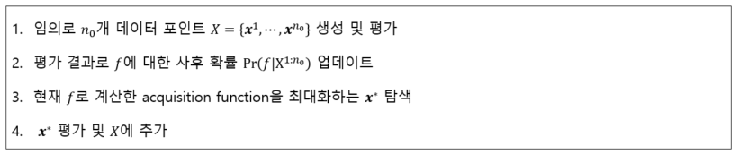 아래 그림과 같이 Acquistion function, surrogate model, objective function으로 구성됩니다.