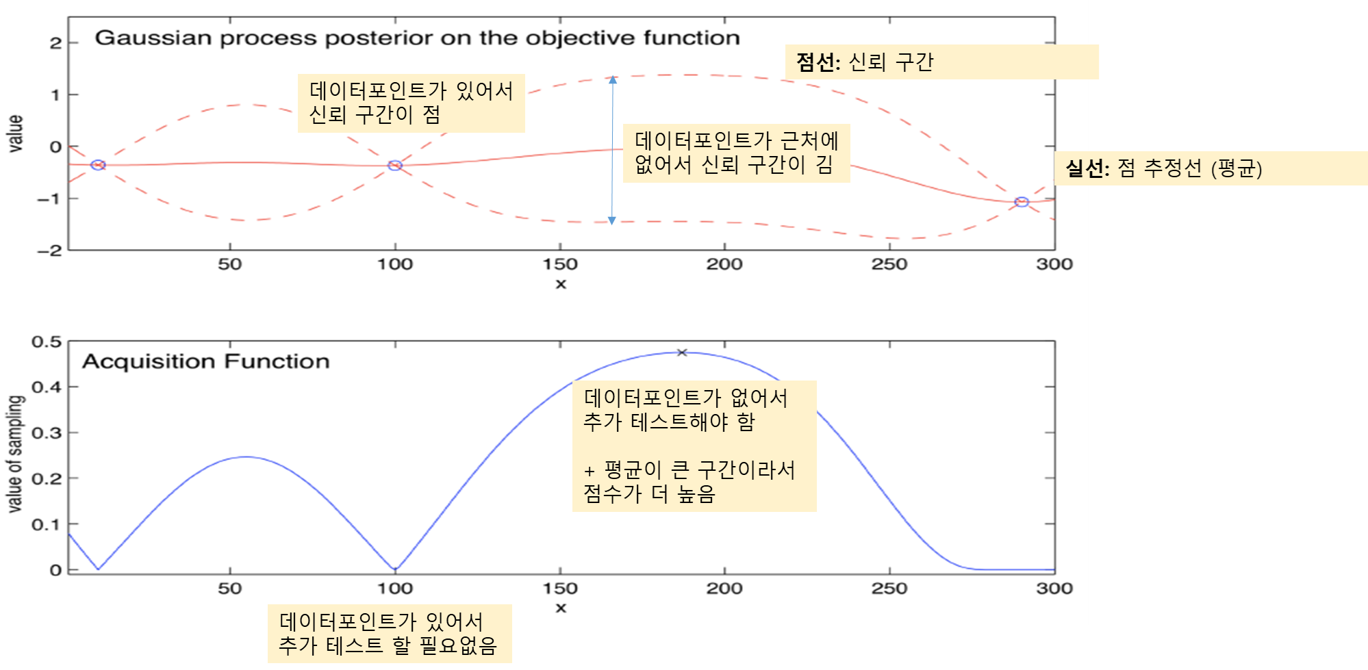 - 이미 테스트한 포인트 근처는 테스트하는데 비용이 많이 들고 노이즈가 없다고 가정했으므로 추가로 테스트하지 않아야 합니다. 따라서 이미 근처를 테스트한 구간은 Acquisition function 값이 0에 가깝습니다.
