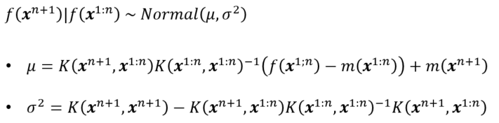 새로운 데이터 x^(n+1)의 함수값 f(x^n)은 다음과 같이 조건부 분포를 이용하여 예측합니다.