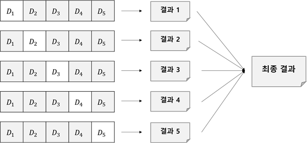 위 그림에서 전체 데이터는 부분 집합 D1 , D2 , D3 , D4 , D5 로 분할됐습니다. 또한, D1 을 제외한 데이터로 모델을 학습하고 D1 으로 평가한 결과부터 D5 을 제외한 데이터로 모델을 학습하고 D5 로 평가한 결과를 종합하여 해당 모델을 최종적으로 평가합니다. 종합할 때는 평균, 중위수, 최솟값, 최댓값 등을 사용합니다.