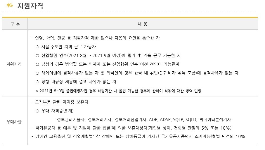 예를 들어, KB국민은행이 2021년 데이터부문 신입행원을 수시채용할 때 썼던 채용 공고의 우대 사항을 보면 위에 언급한 모든 자격증을 우대하고 있음을 알 수 있습니다.