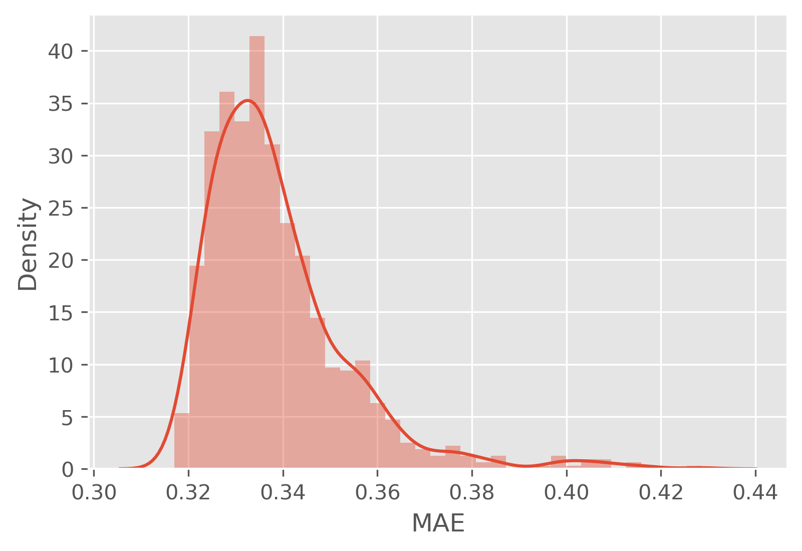 (참고 1) n_MAE의 편차가 작은 데이터(diabetes)의 MAE의 분포는 다음과 같습니다.