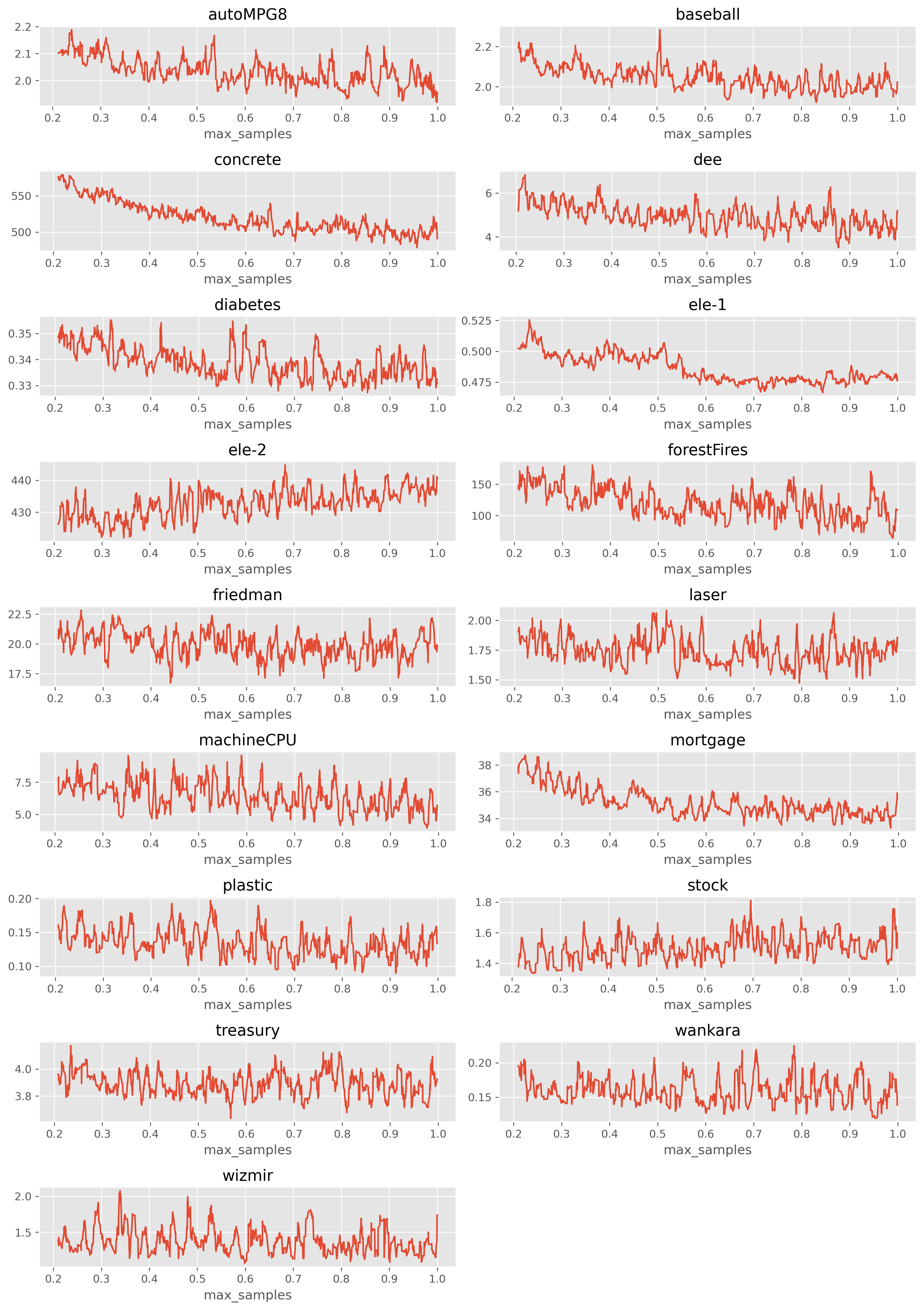 (1) max_samples가 증가함에 따라 MAE가 감소하는 케이스 (예: ele-1, concrete)