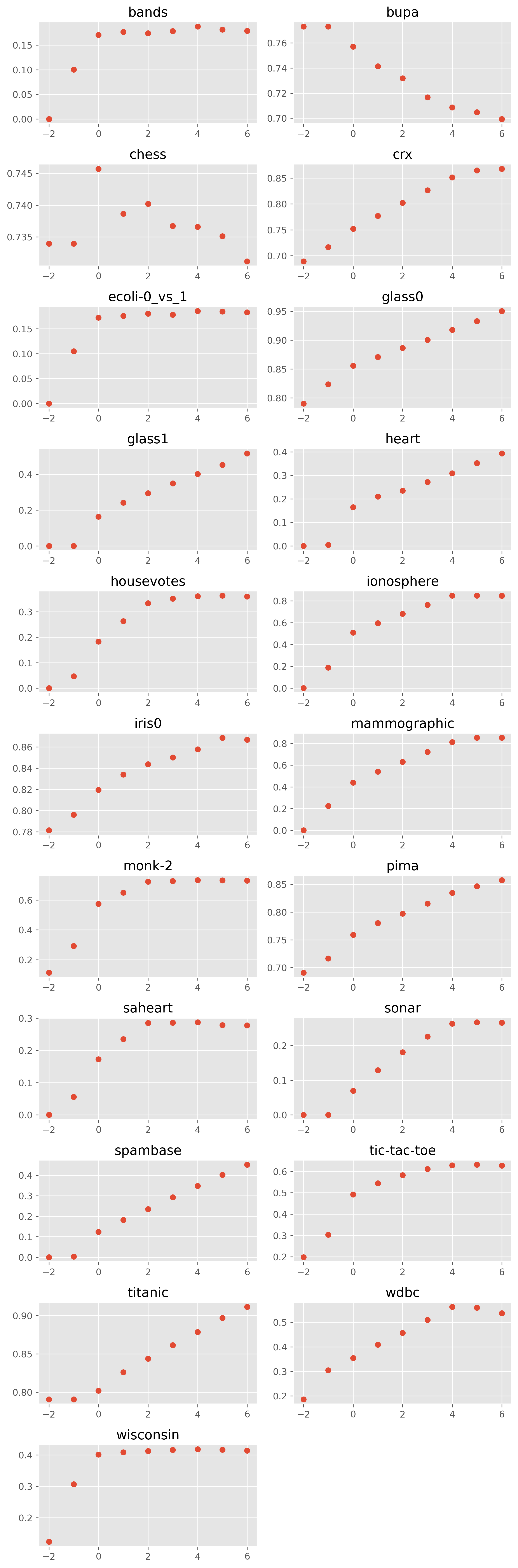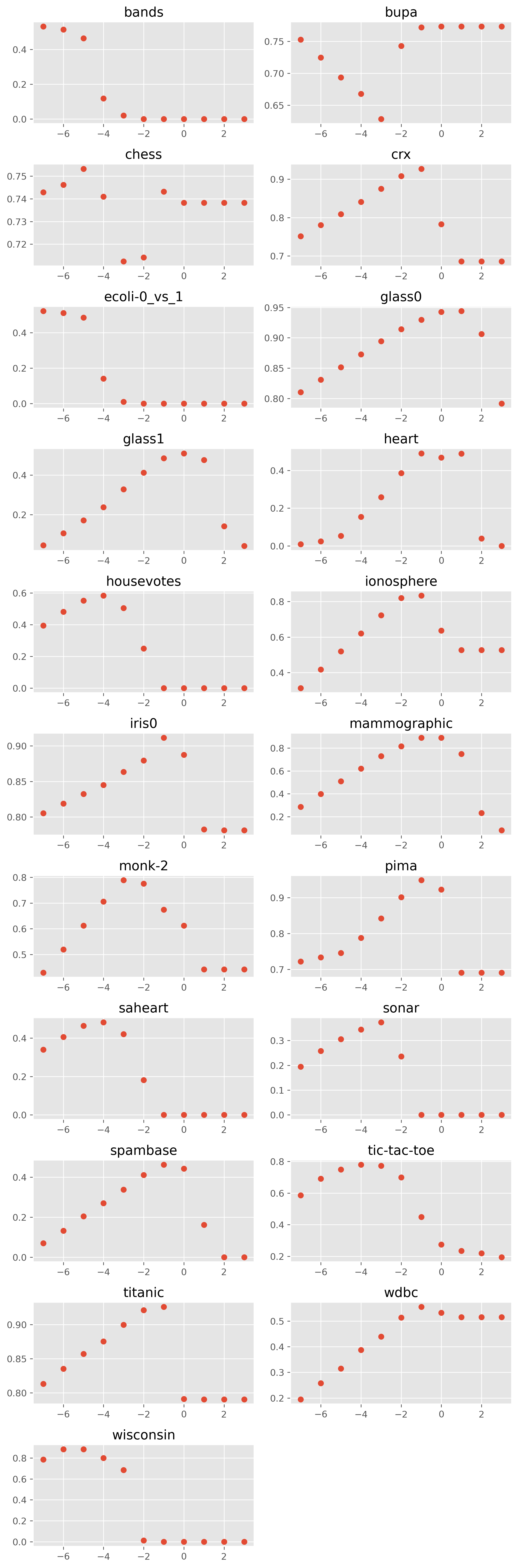 (1) C가 커질수록 성능이 증가하거나, 증가하다 수렴함 (예: titanic, wisconsin). C는 복잡도 파라미터이므로, 만약 더 많은 C를 튜닝했으면 대부분이 결국 수렴하지 않을까 예상할 수 있습니다