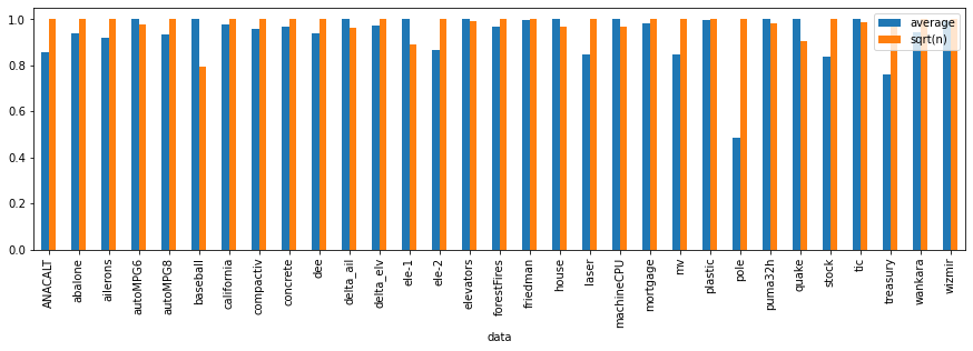 회귀 모델에서 sqrt(n)과 average를 비교한 결과는 아래와 같습니다. 참고로 막대가 높을수록 좋은 결과입니다.
