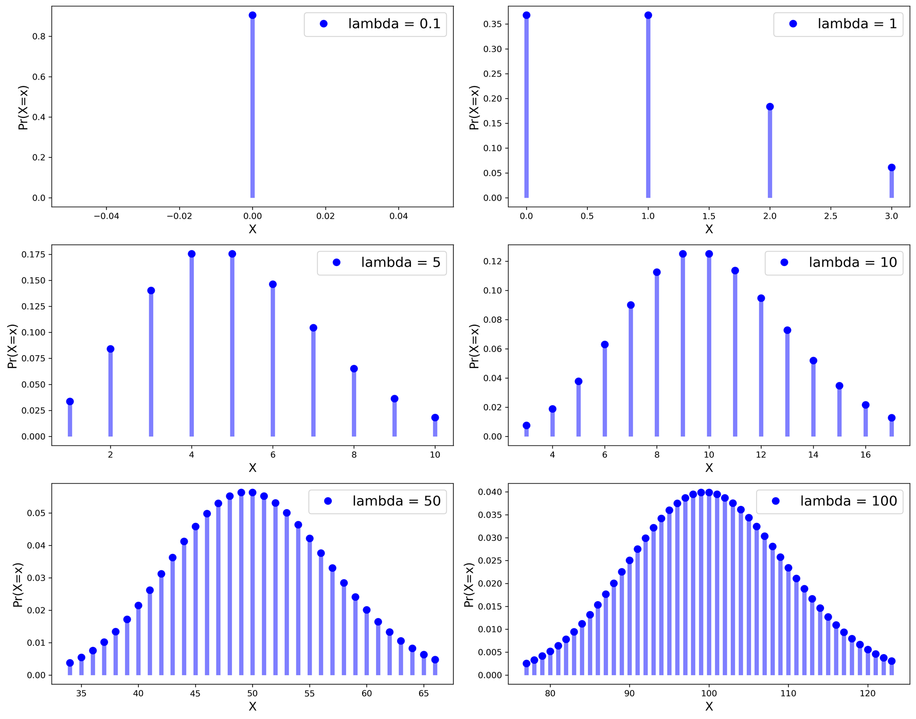 mu에 따른 확률 질량 함수를 표현하면 다음과 같습니다 (참고로 아래 그림에선 뮤를 람다라고 표현했습니다).