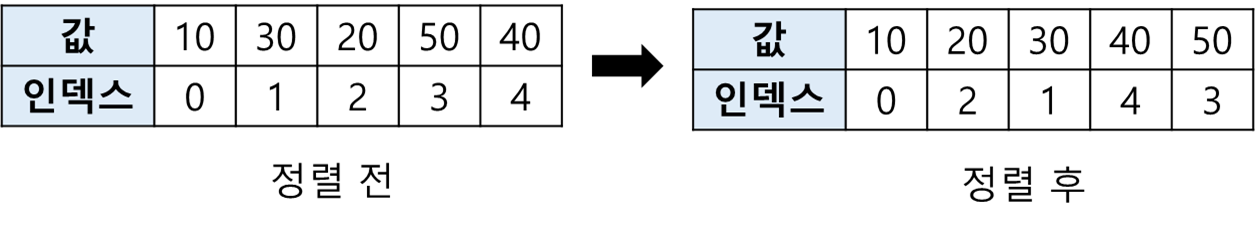 이 배열을 정렬하면 [10, 20, 30, 40, 50]이 됩니다. 이때 인덱스도 배열과 같이 정렬됩니다.