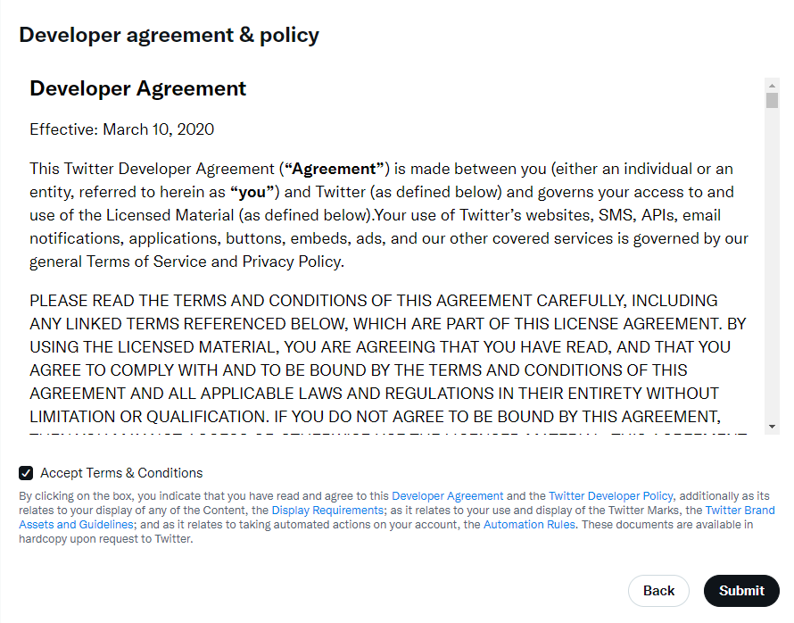 다음으로 Developer agreement & policy 화면이 나오는데, Accept Terms & Conditions을 누르고 Submit을 누릅니다.