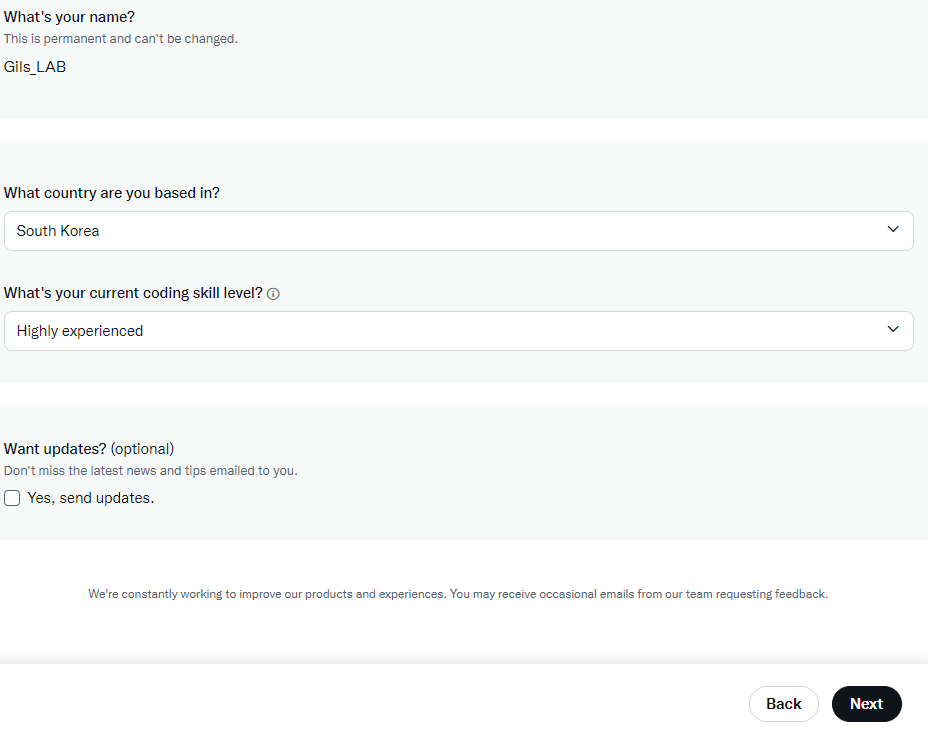 그러면 다음과 같이 국적과 코딩 레벨을 물어봅니다.