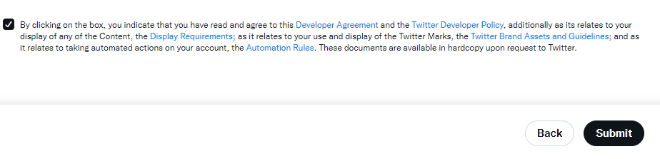 그러면 마지막으로 Developer agreement & policy이 나오는데, 박스를 클릭 후에 Submit을 누릅니다.