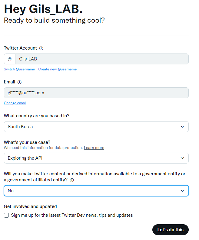 처음 클릭한 것이라면 아래와 같은 화면이 뜹니다. 여기서 Email과 국적, 사용 목적 등을 입력해주고 Let's do this를 클릭합니다.