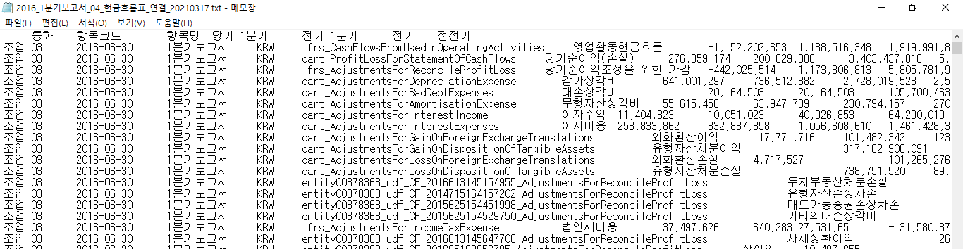 2016_1분기보고서_04_현금흐름표_연결_20210317.txt를 켜서 스크롤을 약간 오른쪽으로 옮기면 아래와 같은 내용을 볼 수 있다.