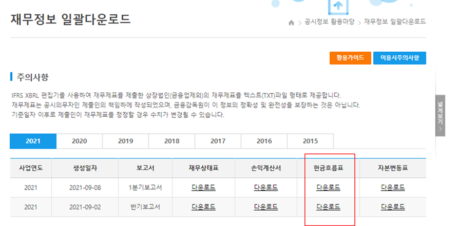 해당 링크에 접속하면 아래와 같이 연도별 모든 기업의 재무상태표, 손익계산서, 현금흐름표, 자본변동표를 다운로드할 수 있다.